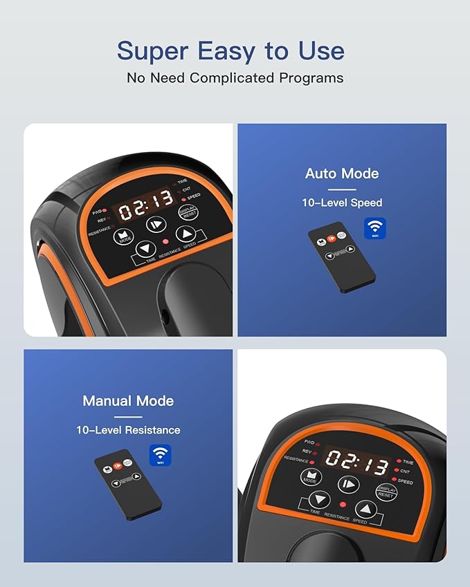 Unlike other electric under desk ellipticals, there are no complicated programs on our machines . All you have to do is press the button on the remote control and start moving.